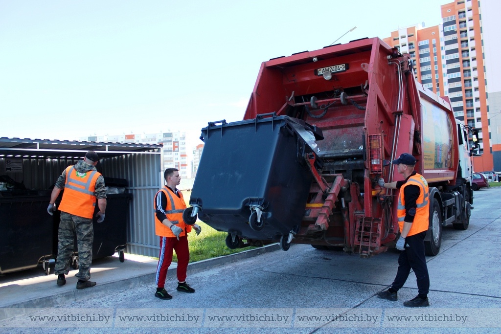 Ежедневно мусоровозы забирают отходы с контейнерных площадок Витебска и района. Самый загруженный день — первый после выходных, понедельник. У каждой бригады, в которую входят водитель мусоровоза и два грузчика, свой маршрут вывоза и график работы.